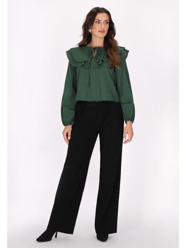 Побалуйте себя женственным очарованием в этой изысканной блузке. Круглый вырез украшен изящной оборкой, которая ниспадает на плечи и создает легкий эффект воланов. Декоративная полоса спереди придает дополнительную привлекательность. Присборенная кокетка спереди придает блузе объем, а рукава элегантно собраны на запястье, образуя объемную манжету.