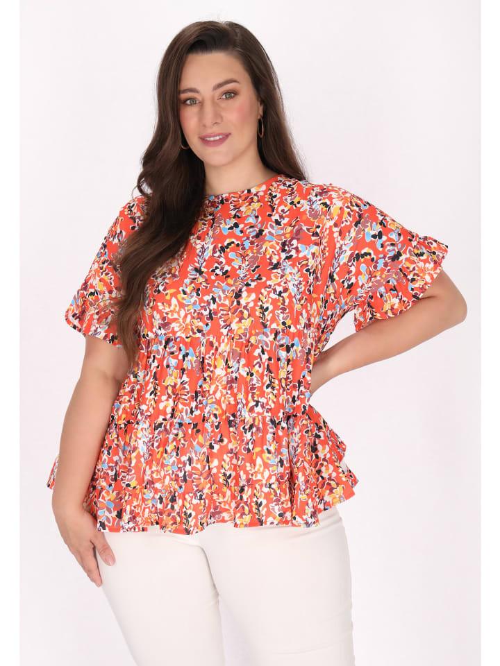 Эта блузка больших размеров с очаровательным цветочным принтом идеально добавит женственности вашему гардеробу. Короткие развевающиеся рукава и свободный крой создают повседневный, но стильный образ. Эта тканая блузка с многоярусным дизайном и эффектом рюшей по низу излучает непринужденную элегантность. Со скромным круглым вырезом и застежкой на спине оно идеально подходит для теплой погоды или многослойных стилей, что делает его универсальным дополнением к любому ансамблю. Этот продукт входит в коллекцию больших размеров.