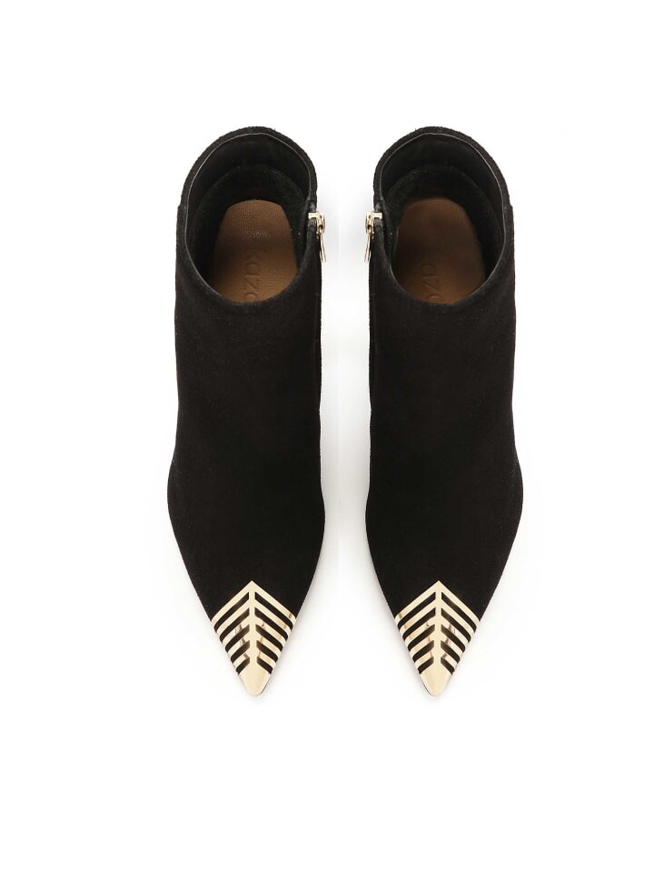 Сапоги из высококачественной черной замши выглядят очень элегантно и стильно. Узкий каблук идеально сочетается с изящным силуэтом обуви и придает ей элегантность и изысканность. Стройный заостренный носок украшен ажурной накладкой золотого цвета. Этот металлический декор придает ботинкам не только оригинальность, но и нотку современности и экстравагантности. Черная замша не только выглядит элегантно, но и обеспечивает высокую износостойкость и комфорт. Текстура замши придает глубину всей композиции, благодаря чему ботинки выглядят еще роскошнее.