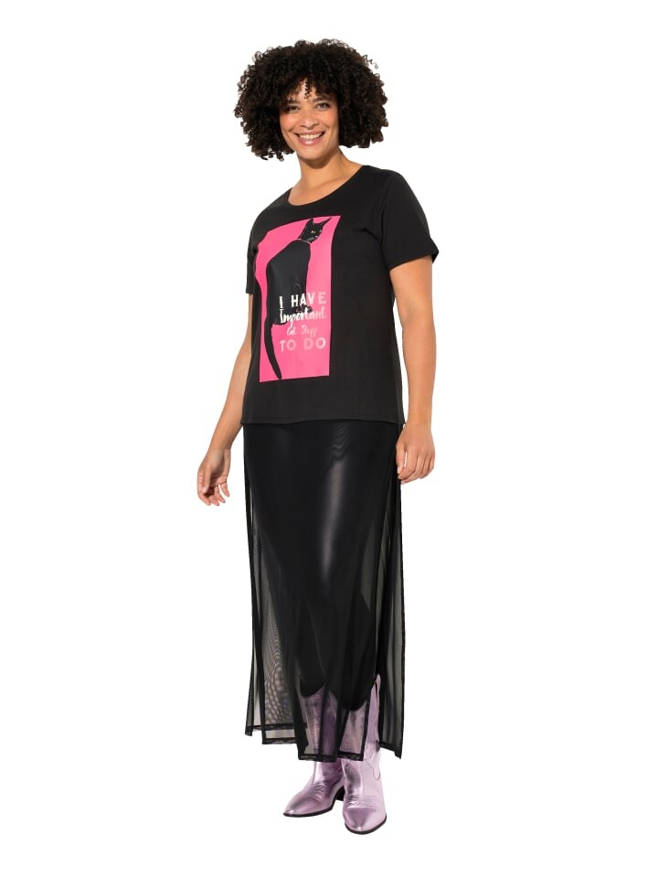 Длинная рубашка А-силуэта с прикрепленной сетчатой юбкой с длинными боковыми разрезами. Рубашка из мягкого трикотажа с кошачьим мотивом, круглый вырез, полурукава.