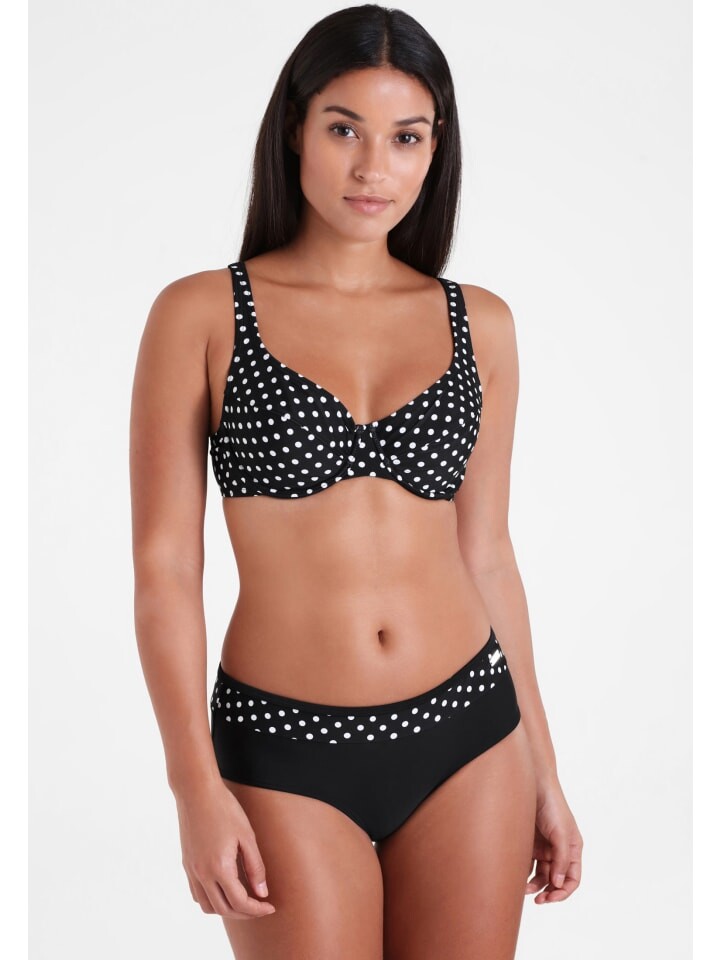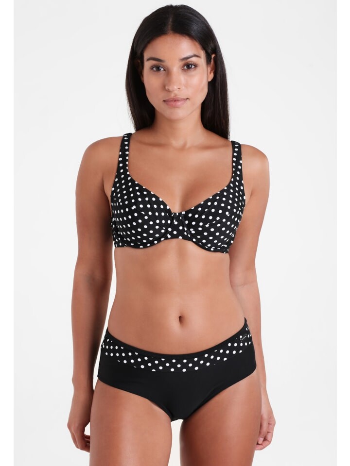 В милом дизайне в горошек. С регулируемыми бретелями. Вставка лифа на чашку. Слегка подкладка спереди. Плавки бикини очень широкие по бокам.