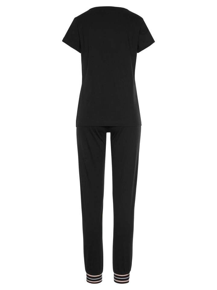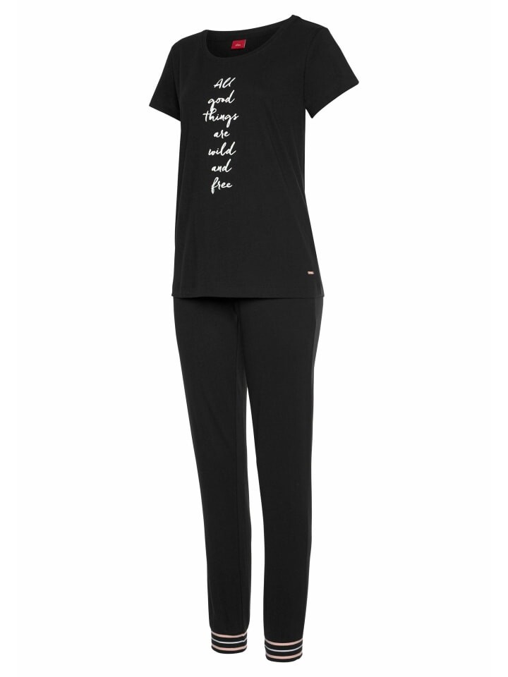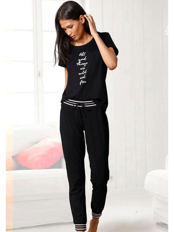Красивая пижама-двойка с полосатым принтом. Рубашка с короткими рукавами, классическим круглым вырезом и модным принтом спереди. Длинные брюки с поясом на кулиске и трикотажным поясом в рубчик. Приятный мягкий хлопок высокого качества.