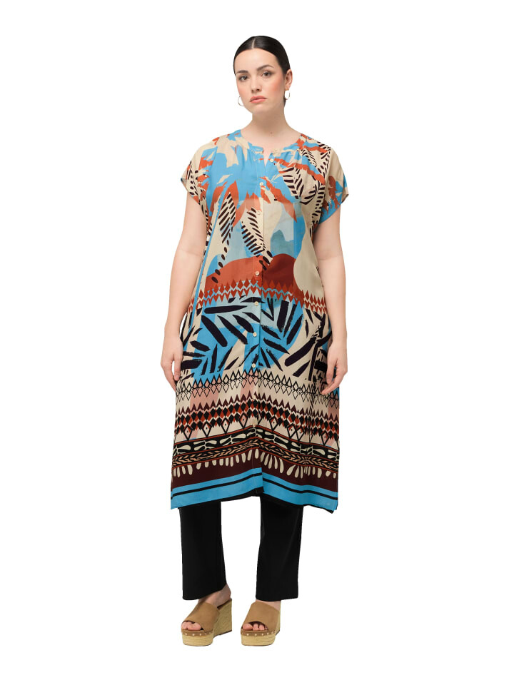 Длинная блузка оверсайз из мягкого крепа с узором «пальма». Круглая горловина, планка на пуговицах, заниженная линия плеча. Боковые карманы, боковые разрезы для плавного спада. Внешний материал: 100% вискоза.