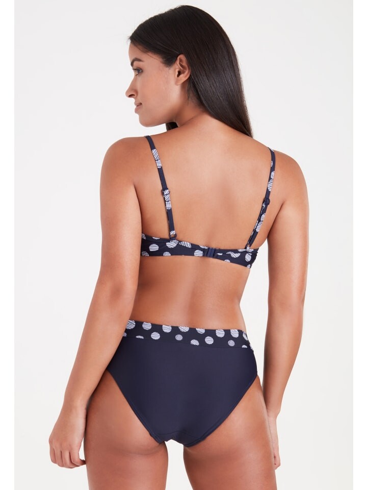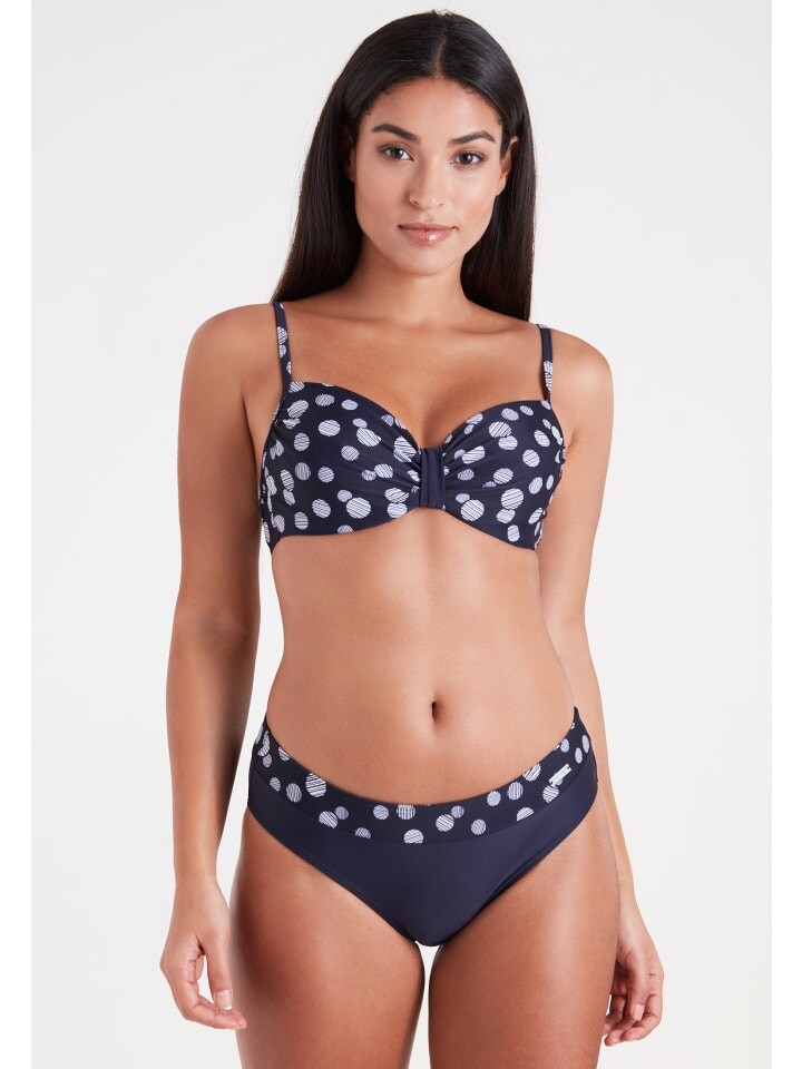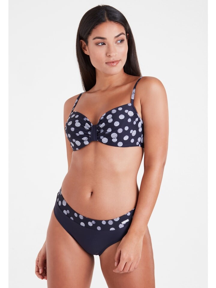 Бикини на косточках от LASCANA модного дизайна с точечным принтом. Топ с регулируемыми бретелями и усилением лифа в области груди. В дополнение к серии есть модные брюки-юбки. Плавки бикини немного шире по бокам.