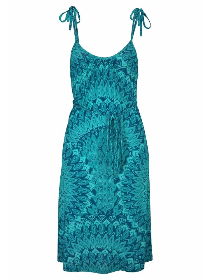 Летнее платье с модным принтом по всей поверхности, каждая деталь уникальна. Ленты-спагетти для завязывания. Узкий пояс на уровне бедер. Длина по спинке около 78 см. Изготовлен из 100% вискозы.