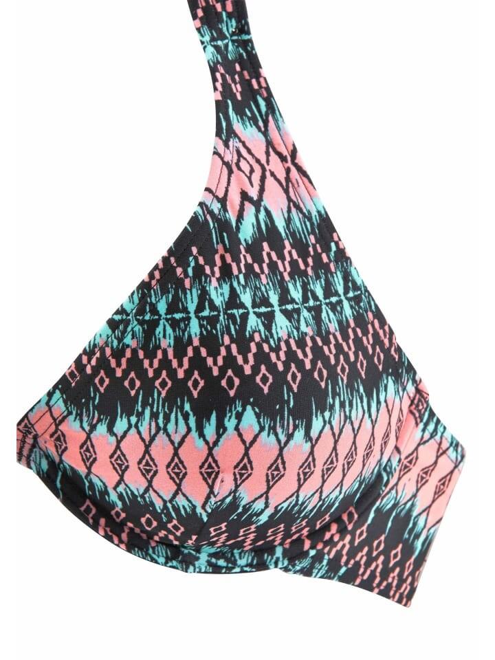 С модным принтом по всей поверхности в этническом стиле. Со съемными чашками. Топ завязывается на шее и застегивается на спине.