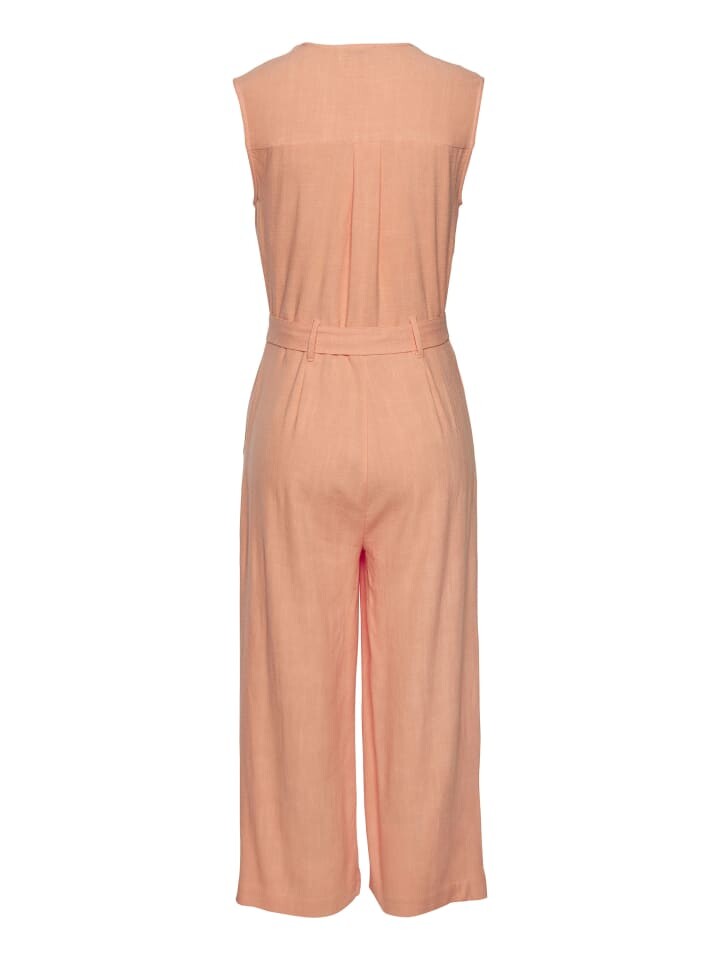 Комбинезон без рукавов от Lascana с V-образным вырезом и короткой планкой на пуговицах. Эластичная талия с завязывающимся поясом. Карманы в боковых швах. Широкие штанины. Комфортный тканый материал из вискозы с содержанием льна.
