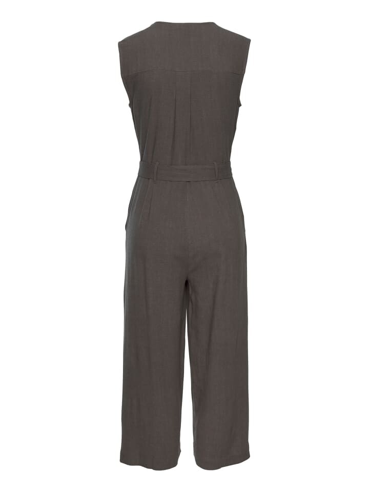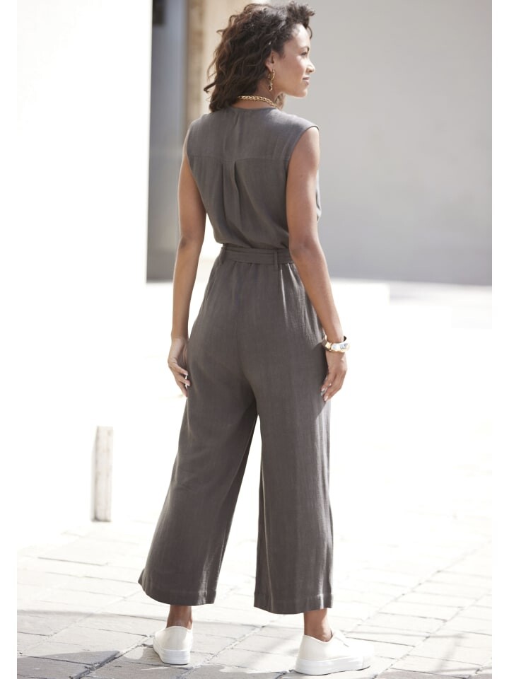 Комбинезон без рукавов от Lascana с V-образным вырезом и короткой планкой на пуговицах. Эластичная талия с завязывающимся поясом. Карманы в боковых швах. Широкие штанины. Комфортный тканый материал из вискозы с содержанием льна.