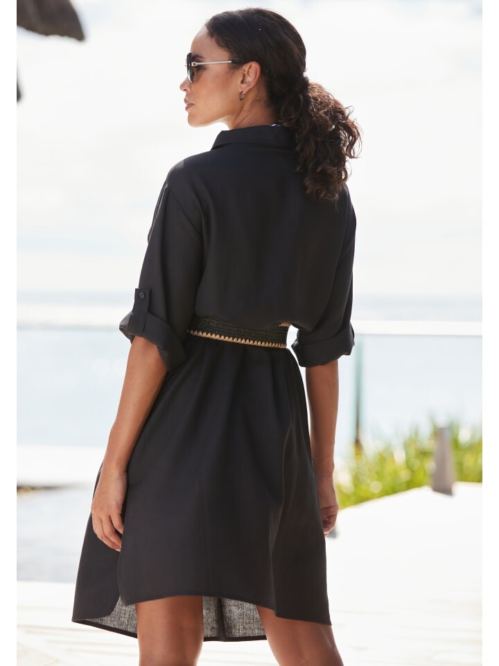Длинная блузка от Lascana. Воротник рубашки, планка на пуговицах во всю длину, нагрудный карман. Рукава 3/4, застегиваются на пуговицы. Низ прямой, с разрезами по бокам. Облегающий фигуру крой. Мягкая на ощупь ткань.