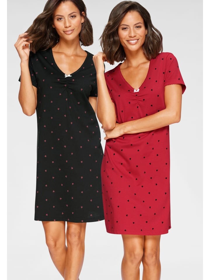 Отличная ночная рубашка от Vivance Dreams в двойной упаковке! С V-образным вырезом, небольшими рюшами и милым декоративным бантиком. Вырез и короткие рукава с красивой окантовкой. Повсюду напечатан милый сердечный принт. Изготовлен из мягкого одинарного трикотажа из 100% хлопка.
