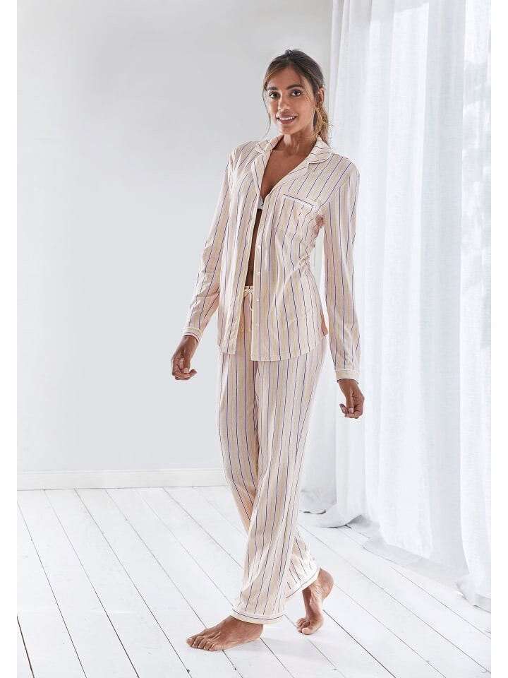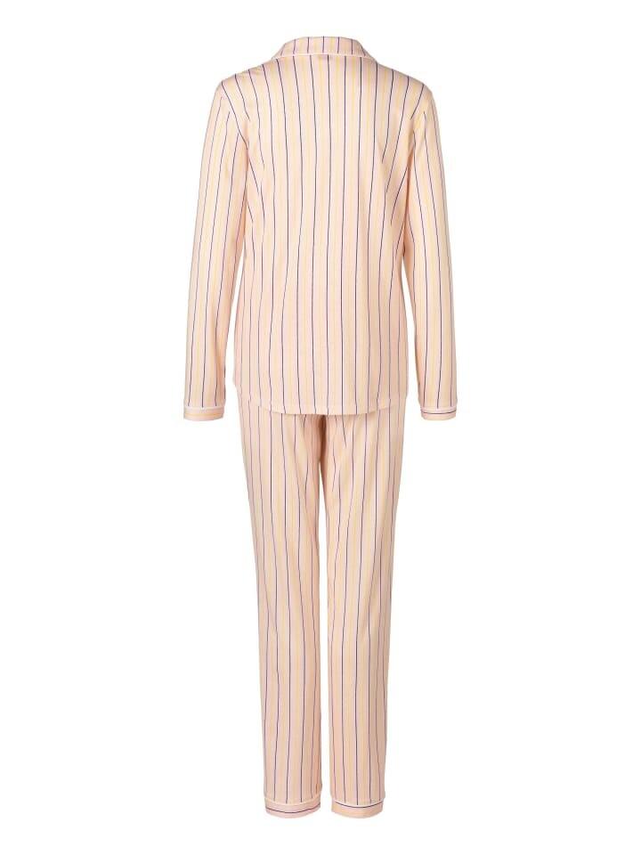 Классическая пижама с воротником с лацканами, планкой на пуговицах во всю длину, нагрудным карманом и контрастной окантовкой. Длинные пижамные брюки с эластичным поясом на кулиске. Приятное качество хлопка и вискозы.