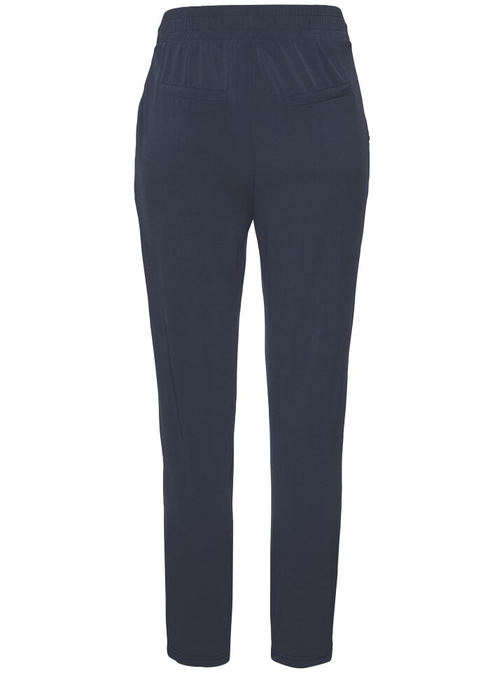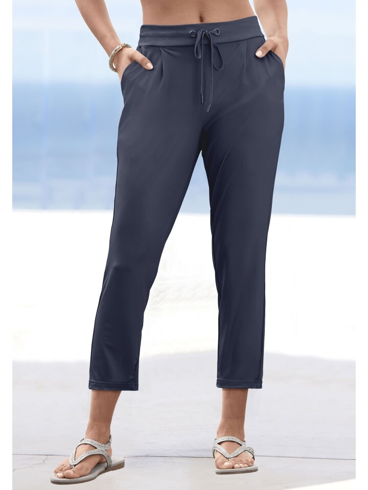 Брюки от Lascana. Эластичный пояс с кулиской спереди, присборенный сзади. Боковые карманы и декоративные прорезные карманы сзади. Тонкая посадка для бега. Гладкое, не мненущееся качество.