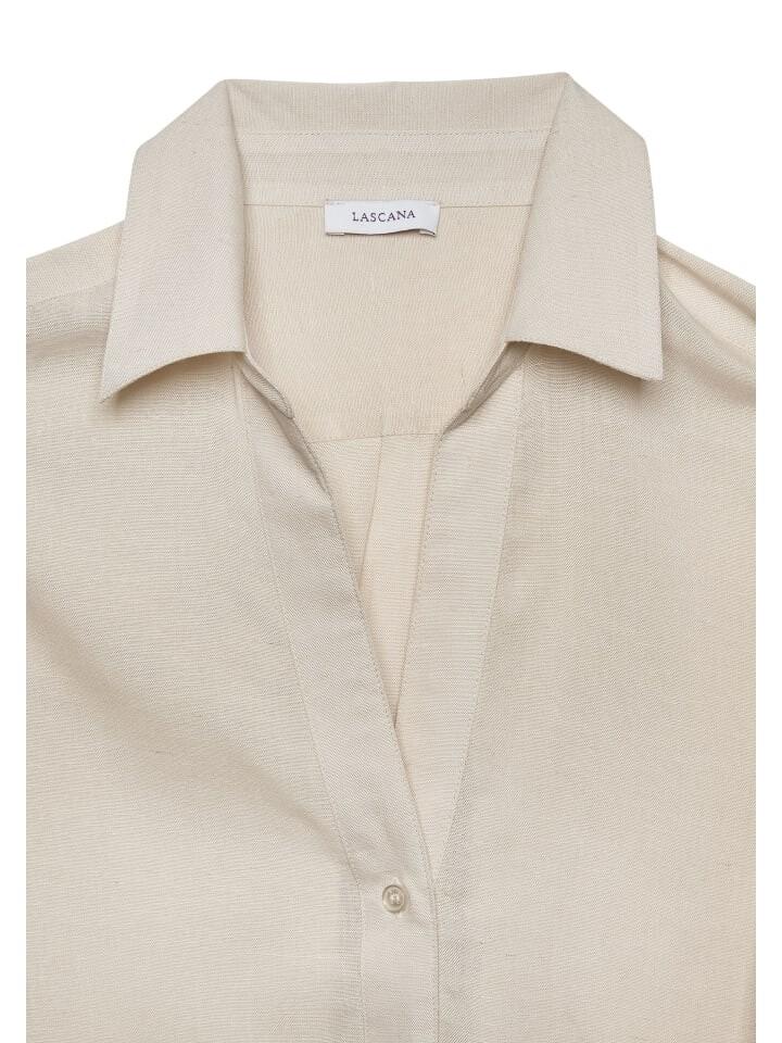 Блузка от Ласкана. Классический воротник рубашки. Низко посаженная планка на пуговицах во всю длину. Спинка с кокеткой и коробчатой складкой. Длинные рукава с манжетами. Закругленный подол блузки. Облегает фигуру. Мягкая ткань из вискозы, хлопка и льна.