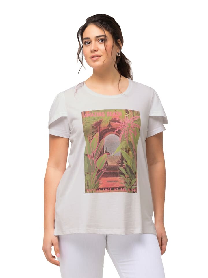 Футболка А-силуэта с декоративным принтом. Круглая горловина, полурукава с рюшами. Боковые разрезы для плавного падения.