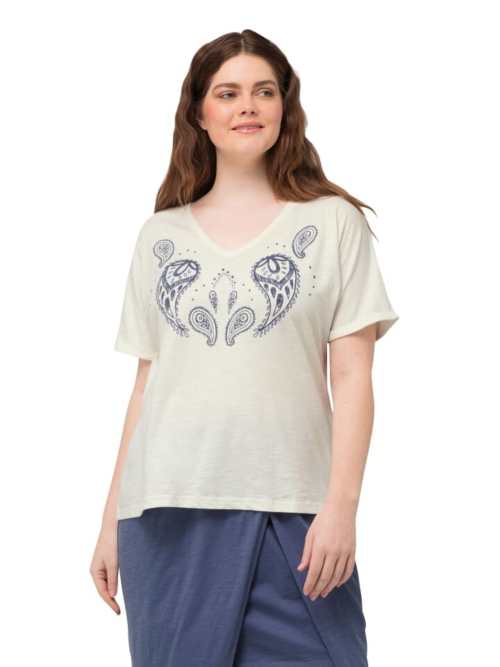 Футболка из натурального хлопка с бархатистым флоком пейсли. Модель оверсайз с закругленным V-образным вырезом, заниженной линией плеча, полурукавами. Низ закругленный и удлиненный сзади. Органический; сертифицирован ECOCERT Greenlife, лицензия № 152026.