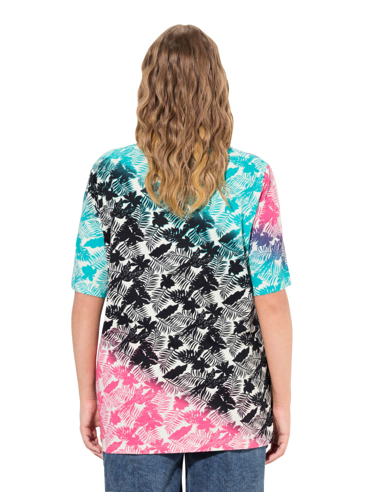 Футболка классического кроя с узором в виде пальмы и цветовым градиентом. V-образный вырез, полурукава. Внешний материал: 100% хлопок.