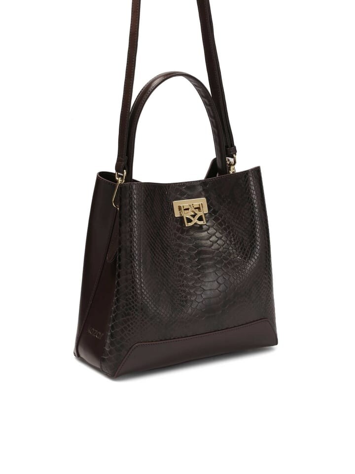 Темно-коричневая сумка прочной конструкции – элегантный и изысканный аксессуар из натуральной кожи. Его широкое основание с металлическими ножками обеспечивает устойчивость и простор, что делает его не только стильным, но и практичным. Передняя часть сумки украшена тиснением под змеиную кожу затененного цвета, подчеркивающим ее неповторимый характер и роскошный вид. Сумочка имеет удобную ручку, позволяющую держать ее в руке, и съемный регулируемый ремень, позволяющий носить ее на плече или через тело. Это отличный выбор как для повседневного, так и для более формального образа, сочетающий в себе функциональность и модный дизайн.