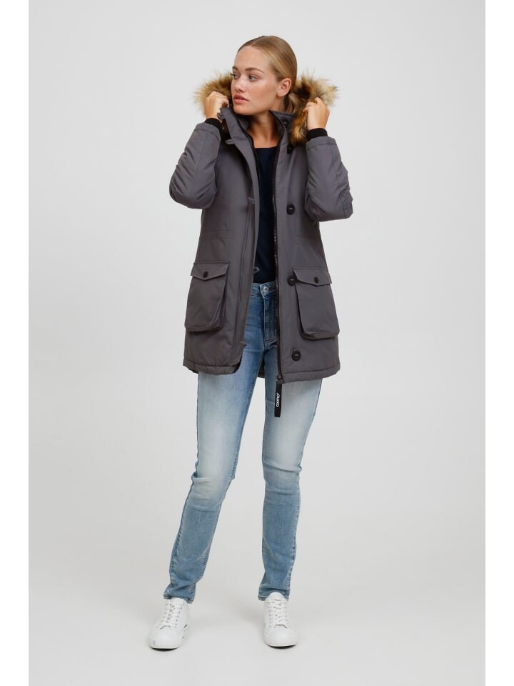 ДЕТАЛИ И ОСОБЕННОСТИ: Утепленная зимняя куртка с капюшоном и кулиской, съемный искусственный мех, высокий капюшон, два кармана с клапанами (застегиваются на пуговицы) с боковыми карманами, два боковых нагрудных кармана на кнопках, один внутренний карман на молнии, потайная молния на пуговице. планка, застежка-молния с тканевой подвеской-логотипом, резиновая нашивка на левом плече, ребристые и эластичные манжеты.