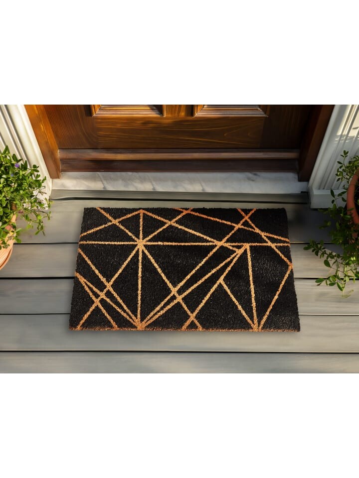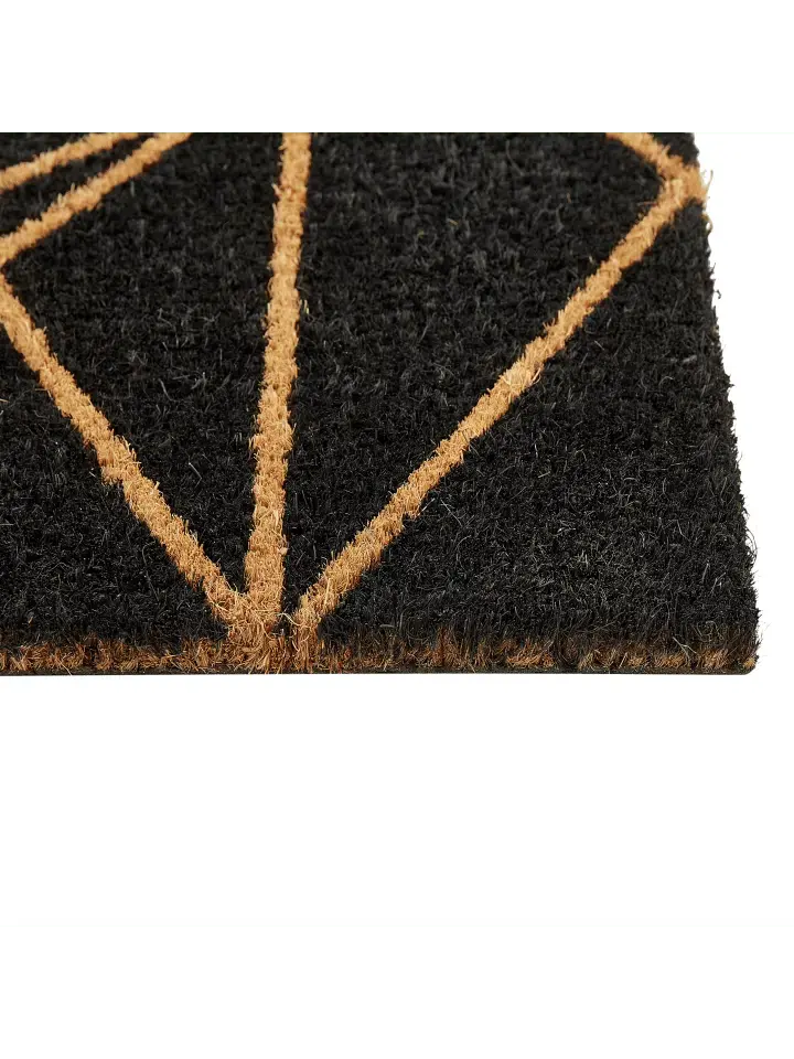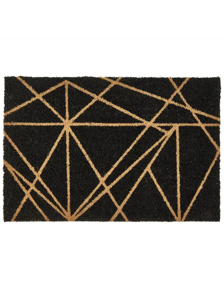 Коврик для дома с нескользящей подложкой. Произведите впечатление на гостей у входной двери — с этим ковриком это легко. Коврик имеет яркий геометрический узор натуральных цветов на черном фоне, который привлекает внимание. Коврик изготовлен из экологически чистого кокосового волокна, что делает его прочным и впитывающим влагу. Нескользящее основание обеспечивает дополнительную безопасность и надежно удерживает коврик на месте. Этот коврик — идеальный выбор для поддержания чистоты полов и придания прихожей современного вида.