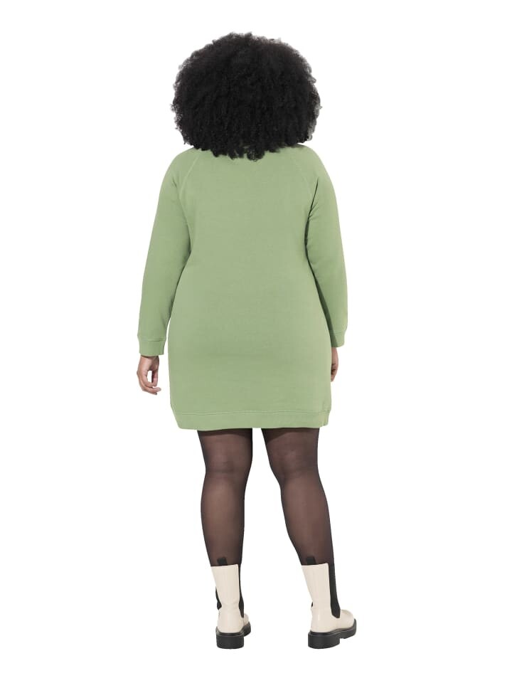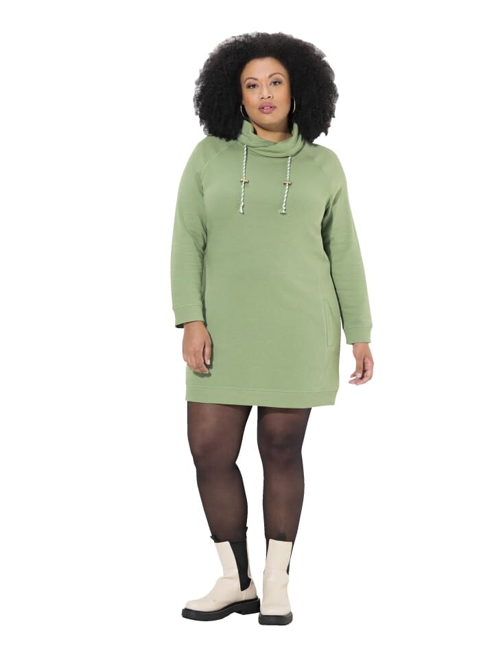 Платье-свитшот с широким воротником-стойкой и завязывающимся ремешком. Карманы в боковых швах, удобные длинные рукава реглан. Ребристые манжеты.