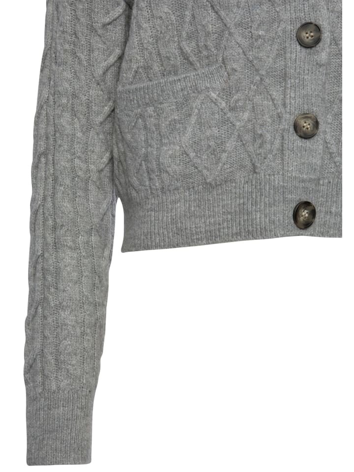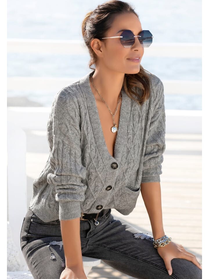Кардиган от Lascana. Модный узор вязания. Слегка укороченная посадка. Планка с пуговицами под роговой узор. С небольшими накладными карманами. Для прохладных дней. Комфортное качество вязки.
