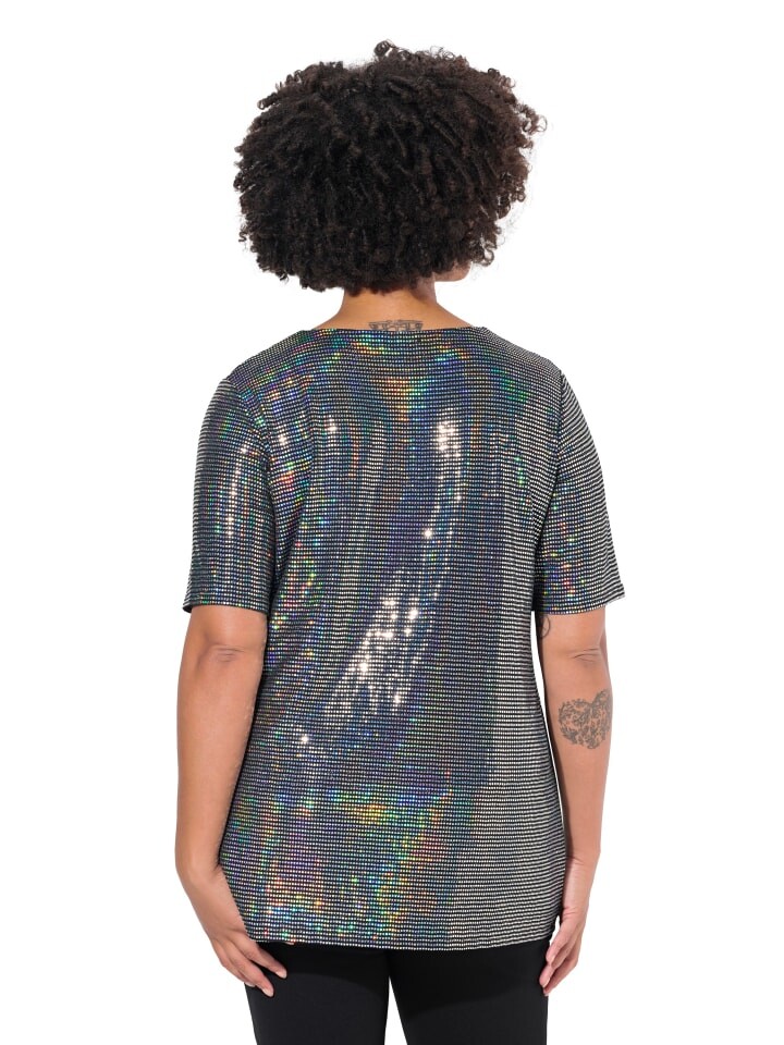 Футболка А-силуэта из мягкого трикотажа, расшитая блестящими пайетками. V-образный вырез, полурукава.