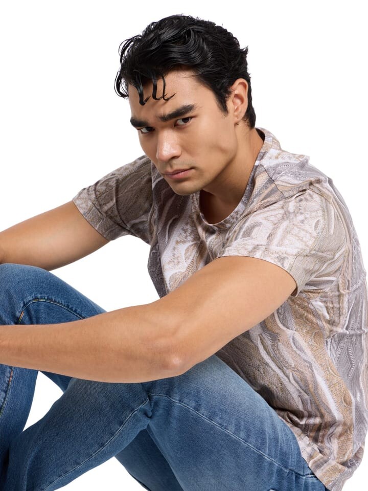 Эта футболка с круглым вырезом станет настоящей изюминкой благодаря эффектному принту. Сочетание рисунка по всей поверхности и круглого выреза придает изделию элегантный, но повседневный вид. Абсолютно привлекает внимание.