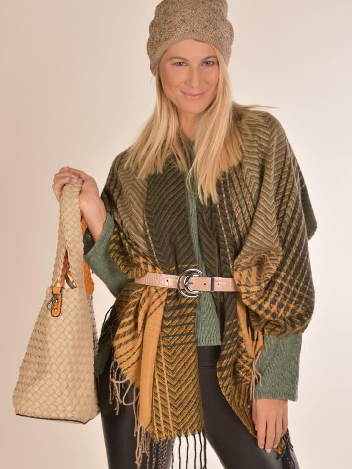- мягкий шарф тонкой вязки с длинной бахромой на концах и разноцветным рваным и полосатым узором