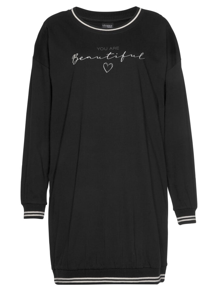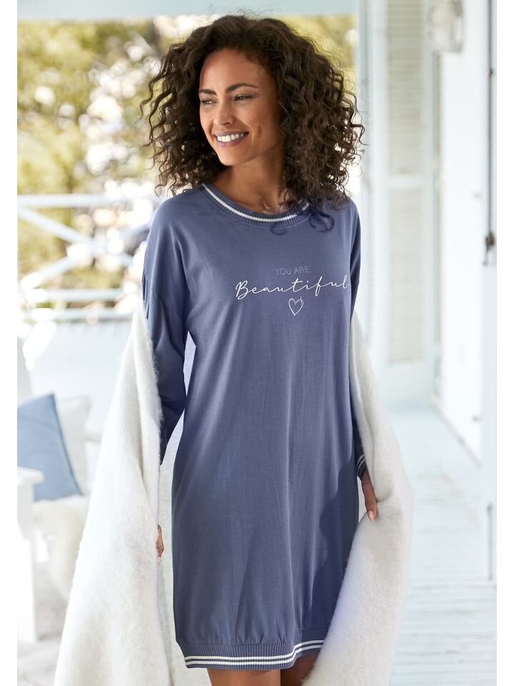 Ночная рубашка от Vivance Dreams. С крупной надписью спереди. Полосатые ребристые манжеты. Круглый вырез. Перерез плеч. Длинные рукава. Мягкий качественный трикотаж из 100% хлопка.
