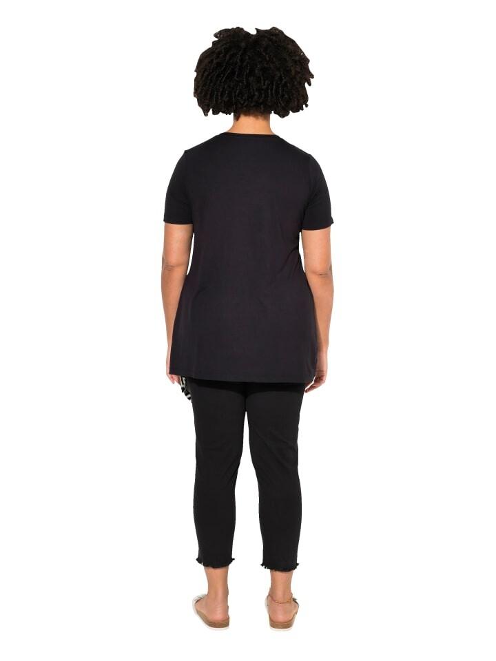 Футболка классического кроя, с декоративными полосками, блестящими пайетками и платочным подолом. Круглый вырез, полурукава.