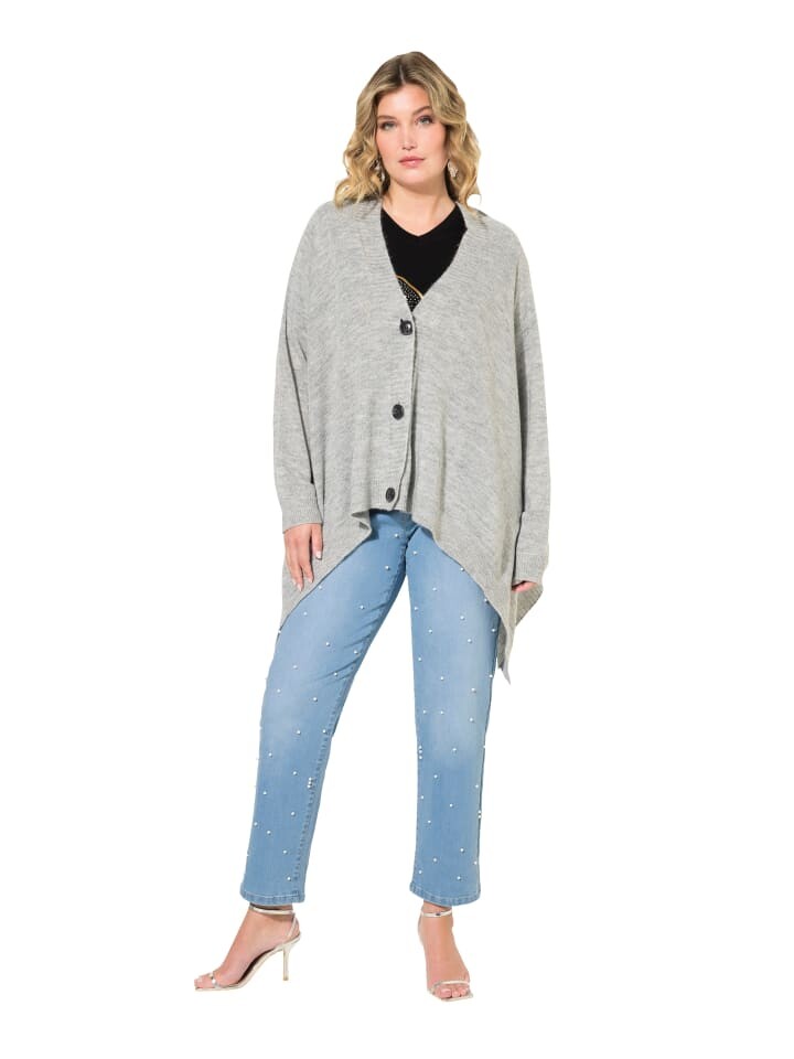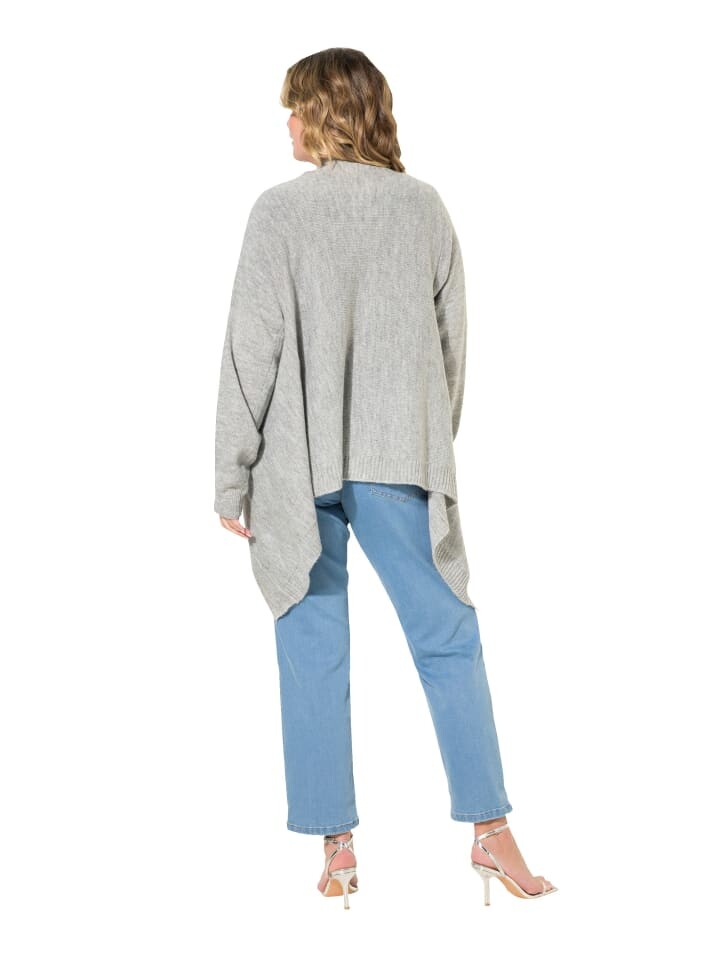 Кардиган в виде широкой накидки. Мягкая тонкая вязка с планкой на пуговицах и широкими длинными рукавами. Заостренный край.