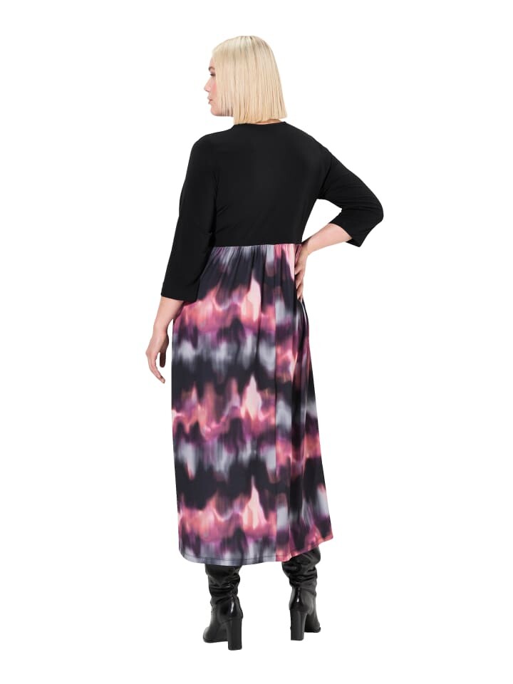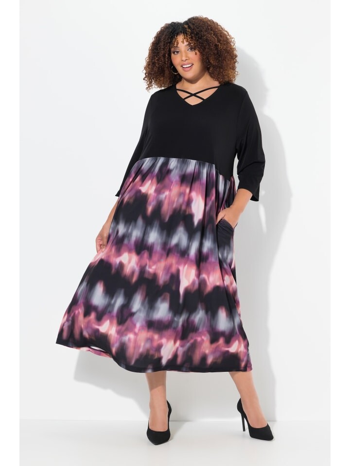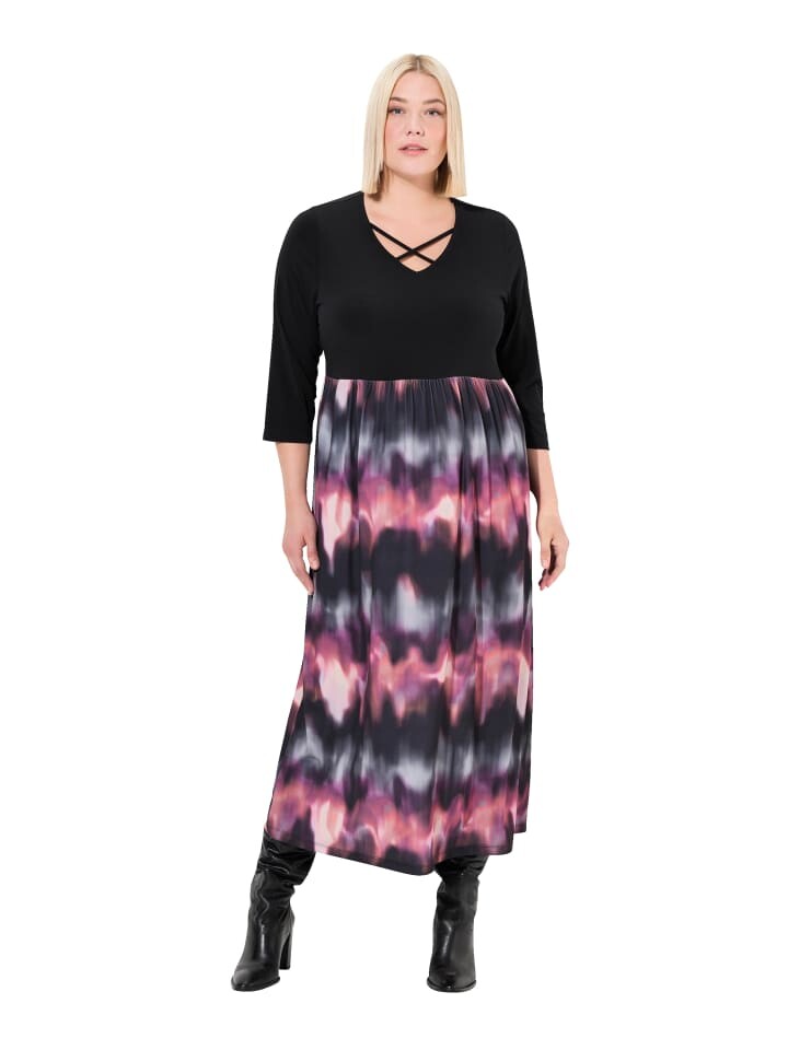 Платье из джерси, А-силуэта, с принтом по всей поверхности. Удобная посадка благодаря декоративным лентам на V-образном вырезе и эластичному ампирному шву. Рукава 3/4.