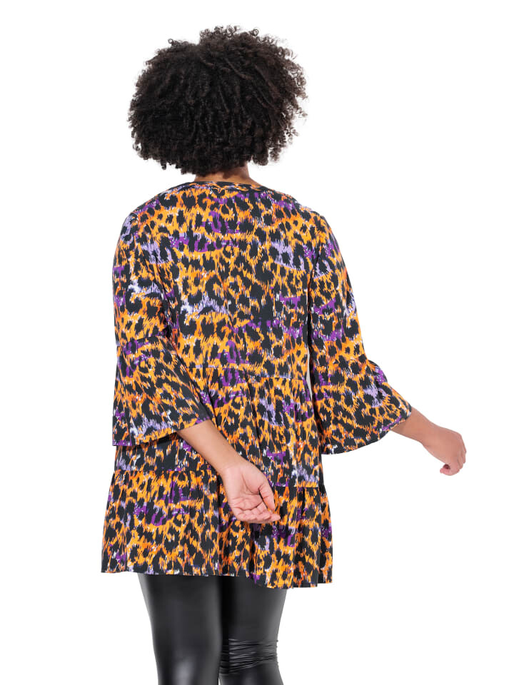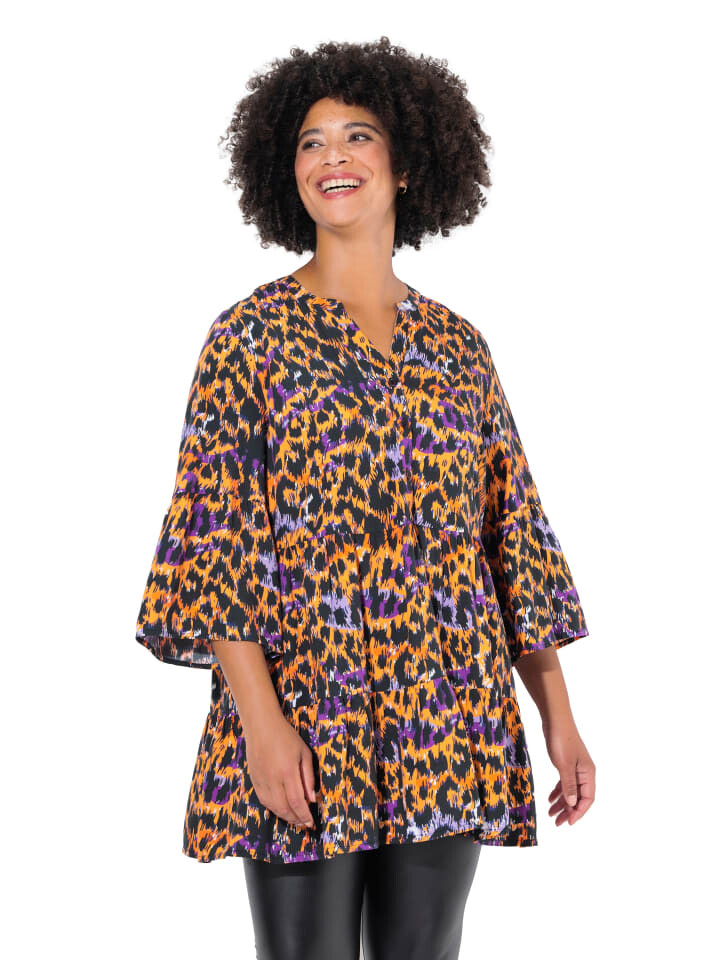 Туника из мягкой вискозы с ярким леопардовым узором. Круглый вырез горловины с планкой на пуговицах. Низ и рукава 3/4 с воланом. Внешний материал: 100% вискоза.