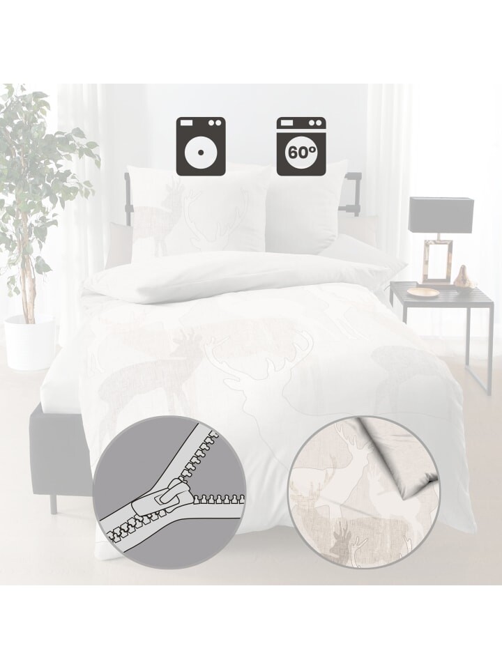Kaeppel тонкое льняное постельное белье «Олень». Впечатляющие мотивы оленей придадут уют и создадут уютную атмосферу в вашей спальне. С двусторонней наволочкой. Мягкая ткань из чистого хлопка впечатляет своим качеством, она плотно сплетена и слегка шероховата. Это делает его особенно мягким, пушистым и приятным для кожи. Уютное лакомство, которое побалует вас уютным теплом прохладными ночами. Легко гладить, дышит, поддерживает баланс температуры и влажности. Молния, экономящая трудозатраты, значительно облегчает надевание