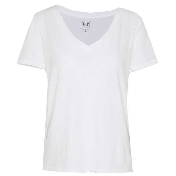 Женская базовая однотонная футболка GAP белого цвета. Выполнена из мягкой и комфортной хлопковой ткани. Вырез глубокий, V-образный. Рукава - короткие. Универсальная модель свободного кроя будет прекрасно смотреться с джинсами, брюками и юбкой, подойдет под кардиган или пиджак.