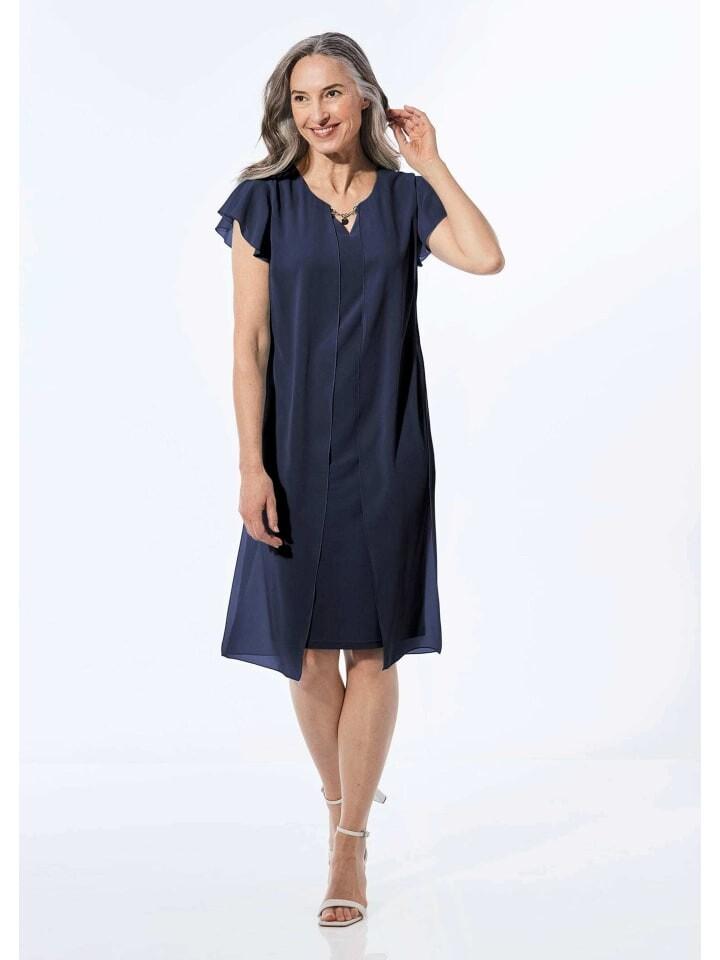 Платье красивой формы и двухслойной работы: нежная шифоновая накидка излучает элегантность - короткие, женственные, игривые рукава также выполнены из тонкой шифоновой ткани и дополняют элегантный образ. Симпатичный декоративный элемент подчеркивает вырез. Сзади на молнии. Длина около 102 см по размеру. 46, размер около 96 см. 23.