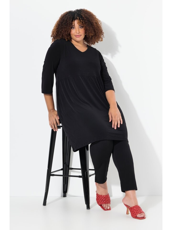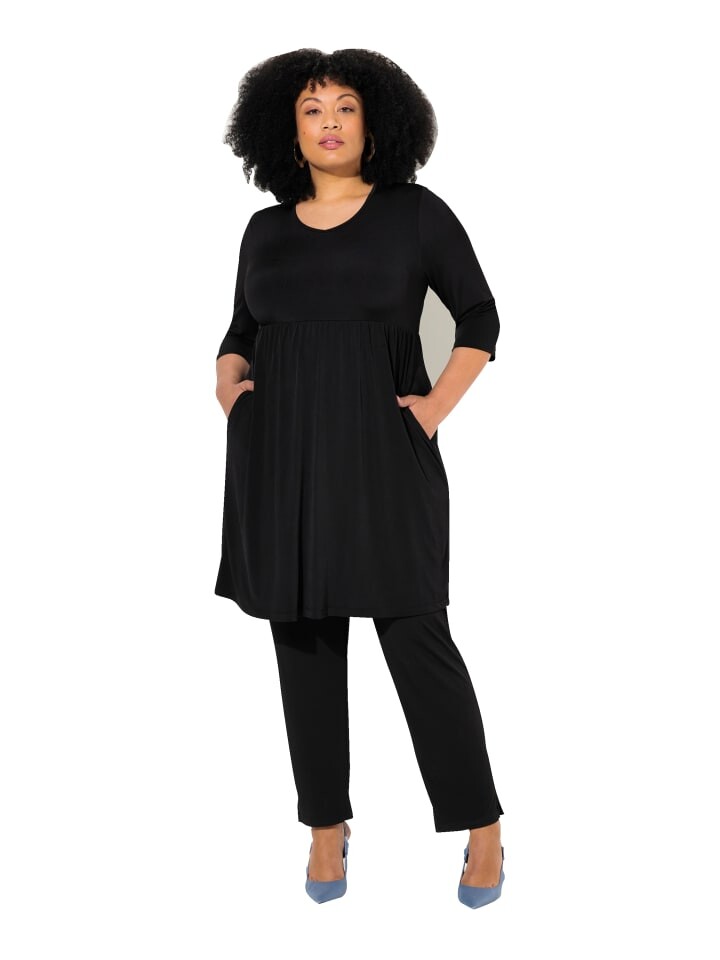 Длинная рубашка А-силуэта с туниковым вырезом и эластичным швом в стиле ампир. Рукава 3/4, карманы в боковых швах.
