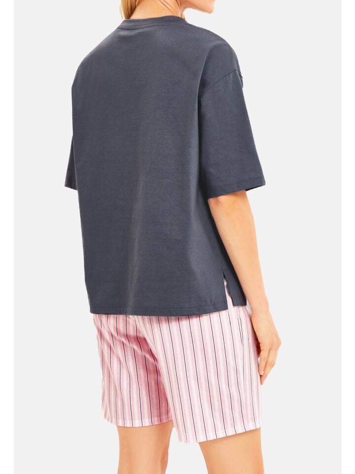 Пижамный комплект, состоящий из рубашки с короткими рукавами и брюк длиной 7/8. Рубашка с круглым вырезом имеет повседневный крой, заниженные рукава и боковые разрезы по подолу для свободы движений и комфорта. Брюки оснащены удобным мягким эластичным поясом, имеют изящную окантовку на поясе и практичные боковые карманы. Спортивный полосатый принт завершает дизайн.
