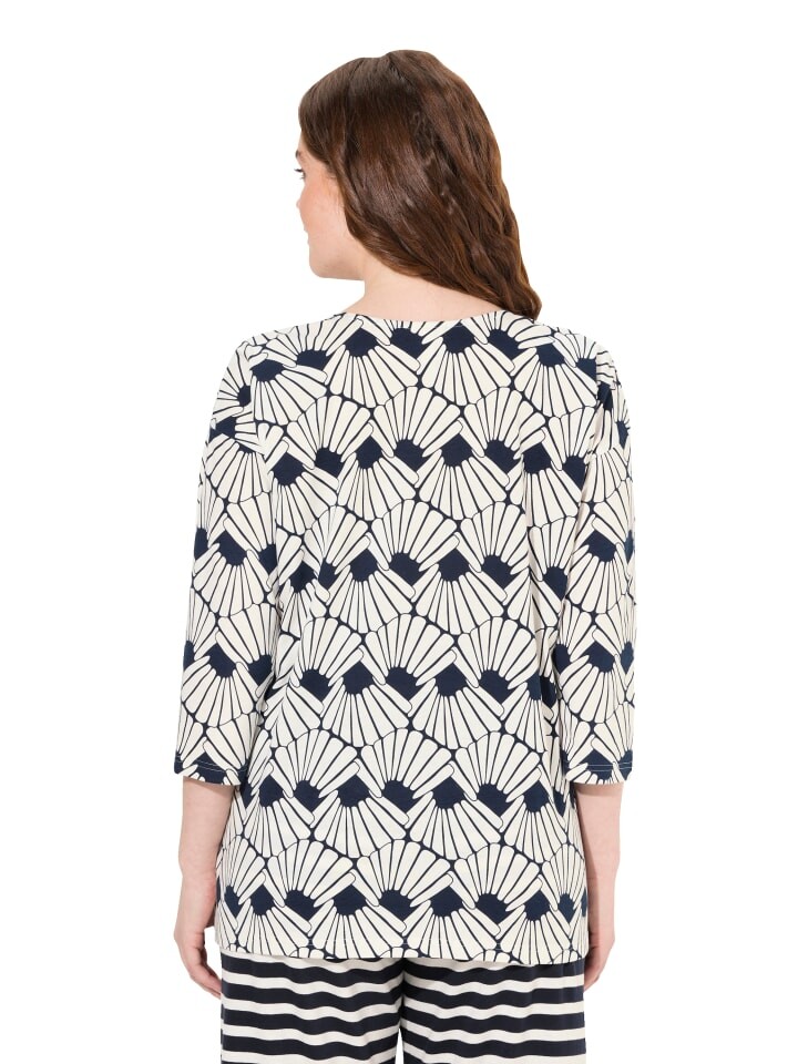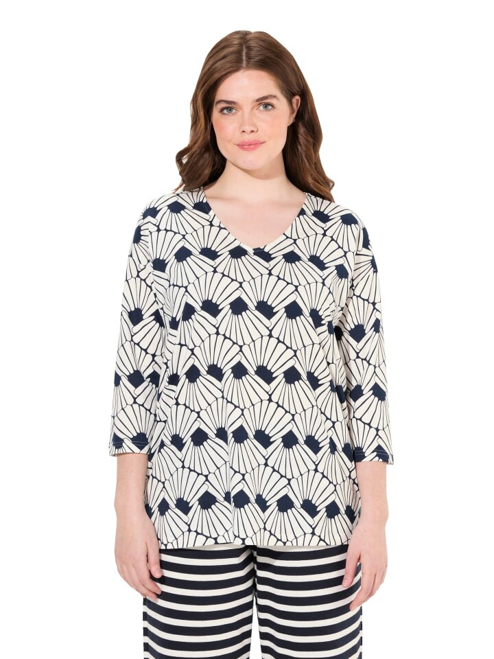 Пижамная рубашка из натурального хлопка, большого размера, с графическим принтом по всей поверхности. V-образный вырез, заниженная линия плеча, рукава 3/4. Боковые разрезы для гладкой драпировки. Органический; сертифицирован ECOCERT Greenlife, лицензия № 152026.