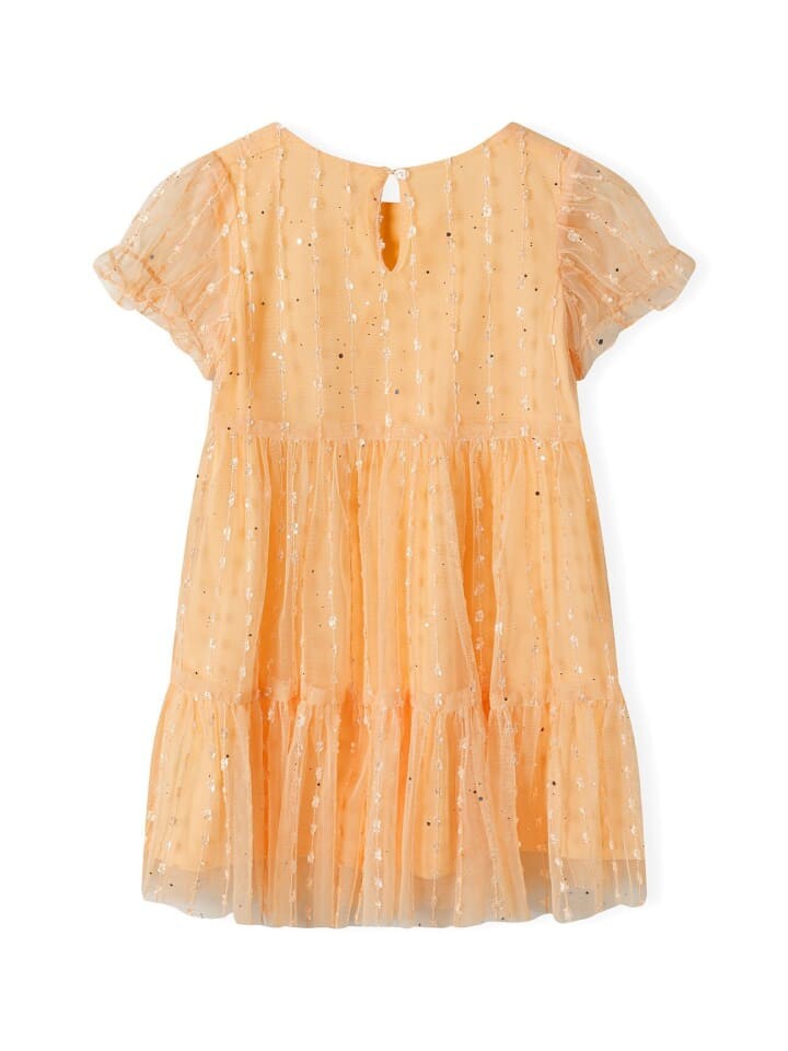 Красивое платье из тюля с блестящими элементами и модной вышивкой. Рукава с рюшами удобны благодаря эластичным манжетам. Платье застегивается на пуговицу сзади.
