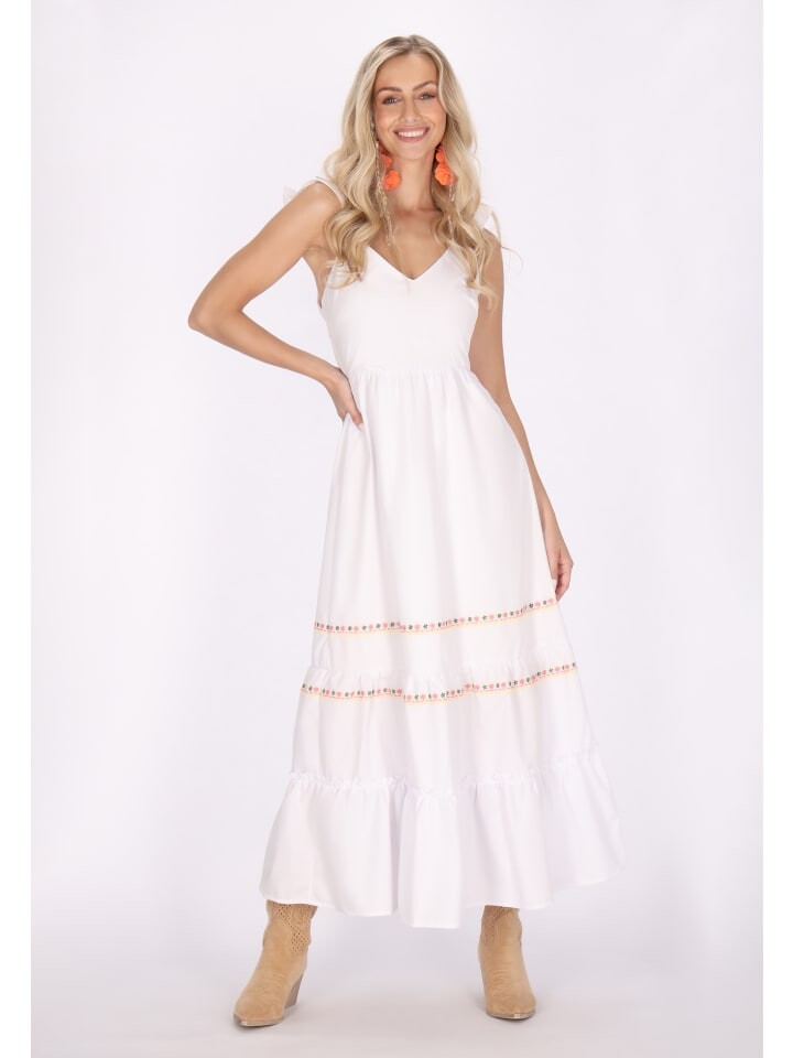 Украсьте свой летний образ этим платьем макси с V-образным вырезом, бретелями и этнической вышивкой. Приталенный лиф плавно переходит в расклешенное платье с многоярусными слоями, каждый из которых украшен оборками и декоративной отделкой, придающими нотку элегантности. Это длинное платье идеально подходит для повседневных мероприятий или в качестве уникального варианта свадебного наряда. Оно излучает шарм и стиль.