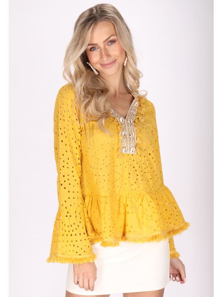 Представляем изысканную блузку с уникальным расклешенным дизайном на манжетах и талии. V-образный вырез украшен замысловатыми украшениями, возможно, кружевом или вышивкой, а также нежной вышивкой бисером или пайетками. Ткань с рисунком в горошек придает структурированность этому изделию в богемном стиле. Рукава-колокол и расклешенный подол создают эффект баски, создавая женственный и праздничный образ.