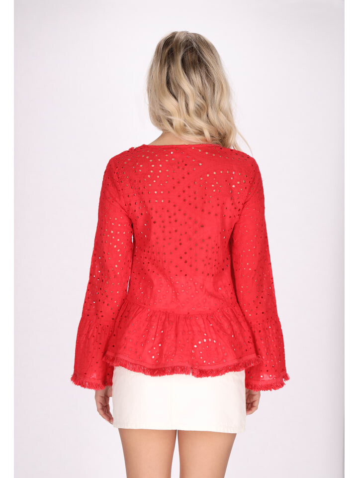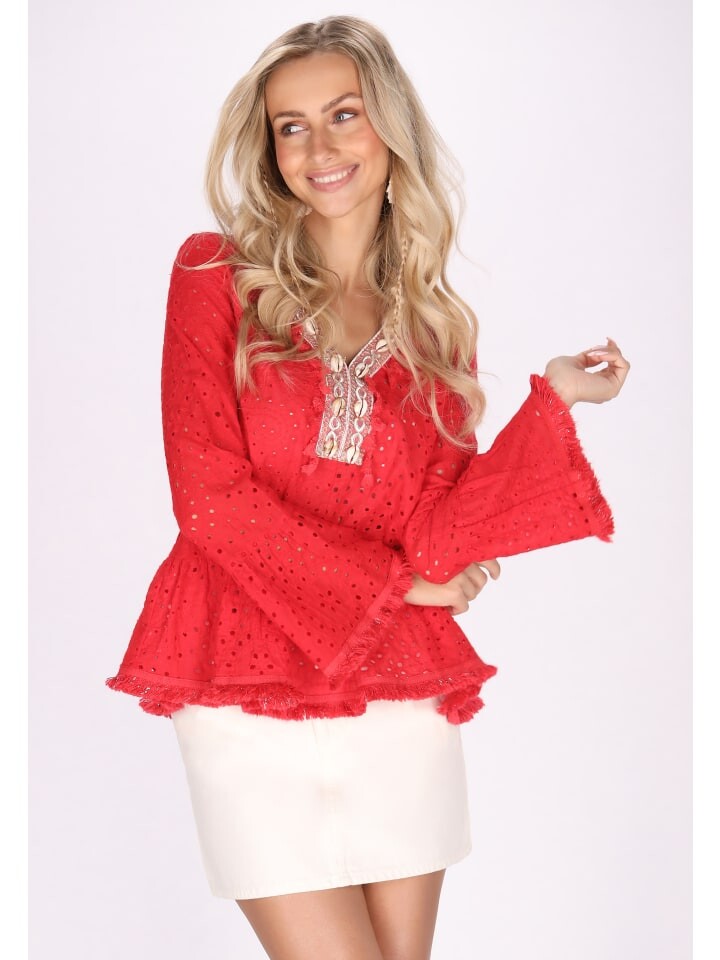 Представляем изысканную блузку с уникальным расклешенным дизайном на манжетах и талии. V-образный вырез украшен замысловатыми украшениями, возможно, кружевом или вышивкой, а также нежной вышивкой бисером или пайетками. Ткань с рисунком в горошек придает структурированность этому изделию в богемном стиле. Рукава-колокол и расклешенный подол создают эффект баски, создавая женственный и праздничный образ.