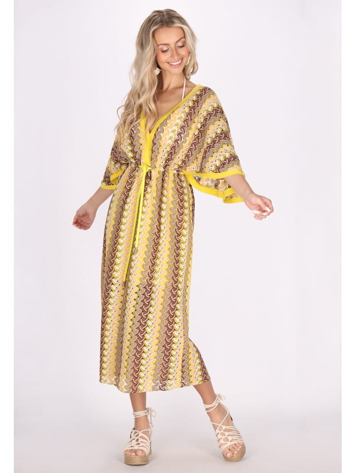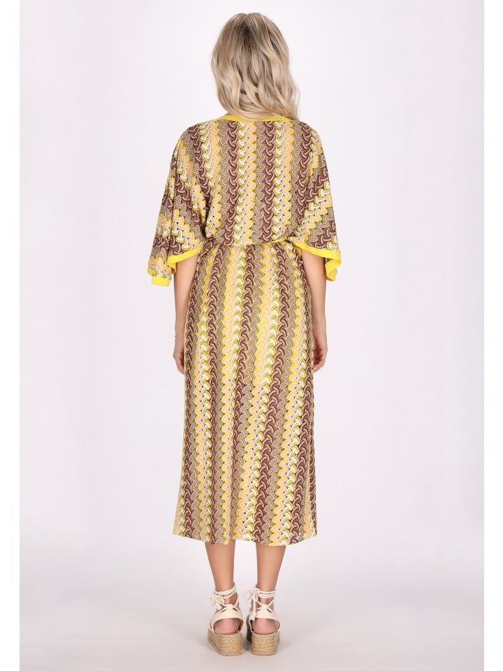 Создайте стильный образ с этим платьем миди с V-образным вырезом и узорчатой текстурой. Это трикотажное платье свободного кроя и регулируемых завязок на талии излучает летнее очарование. Рукава три четверти с манжетами в форме колокола придадут нотку стиля повседневному или пляжному образу. Это праздничное платье, украшенное повторяющимися оборками и контрастной отделкой, идеально подходит для случаев в теплую погоду.