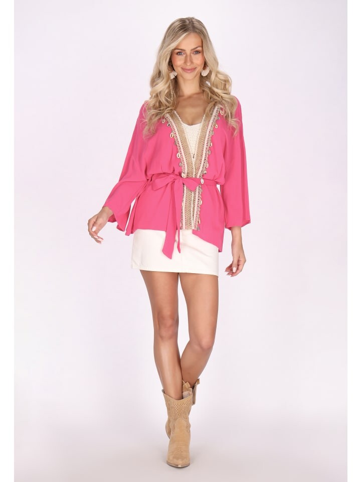 Эта легкая и свободная вещь станет универсальным дополнением вашего гардероба. Модель с длинными рукавами и поясом на талии для индивидуальной подгонки имеет V-образный вырез и замысловатые декоративные украшения по краям и переднему вырезу. Узорчатый дизайн украшений создает яркий контраст и легко дополнит ваш повседневный или домашний ансамбль.
