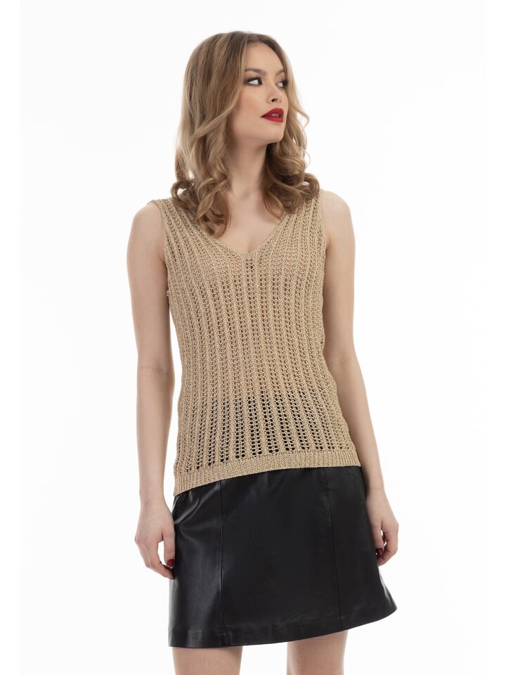 Вязаный топ Faina, сделанный в Италии, станет идеальным дополнением всего вашего летнего гардероба. Благодаря крупному трикотажному узору, обработанному блестящей металлизированной пряжей, дизайн впечатляет своей модностью. Стильная, облегающая фигуру модель с ребристыми манжетами дополняет эффектный образ. Для модного вечернего наряда сочетаем топ с соответствующим кардиганом бренда.