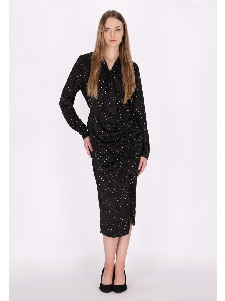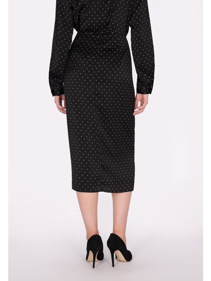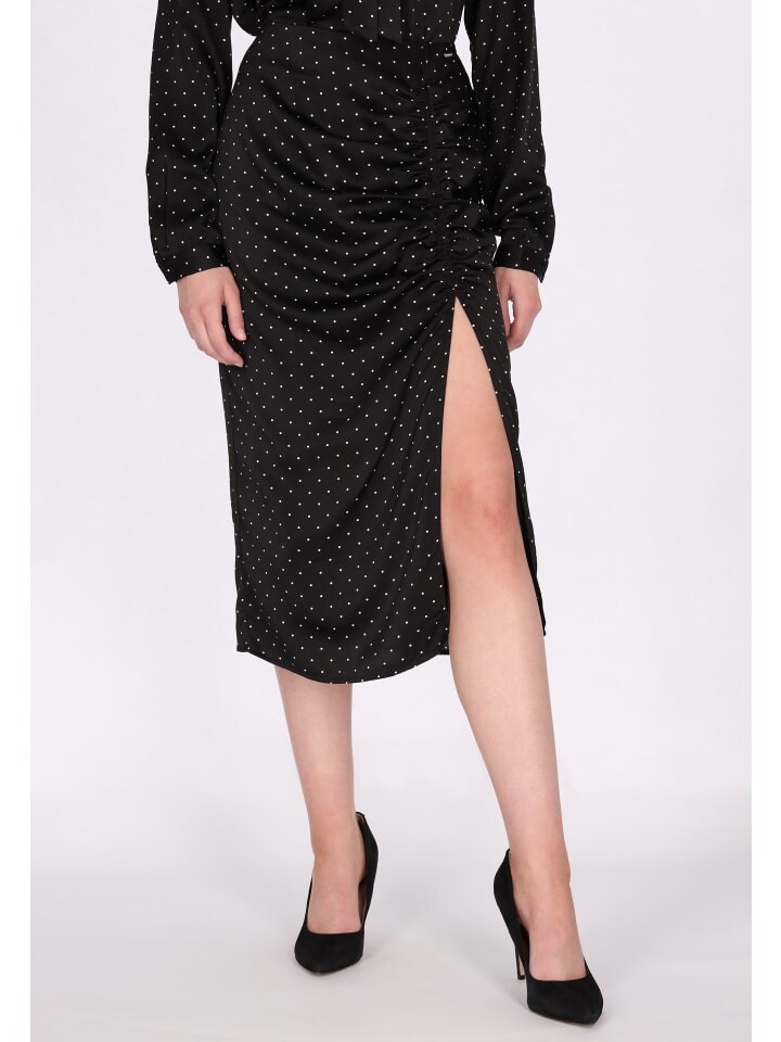 Эта элегантная юбка-миди с очаровательным точечным принтом придаст вашему гардеробу нотку причудливости. Тканый материал красиво драпируется вокруг бедер, подчеркивая ваш силуэт. Уникальная сборка на одной стороне создает эффект рюшей, а разрез подчеркивает свободу движений и стиль. Идеально подходит для тех, кто ищет изысканный и элегантный образ.
