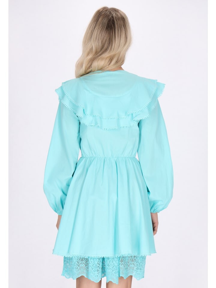 Украсьте свой гардероб этим мини-платьем из хлопка с рюшами, рукавами-колокольчиками и объемным воротником. V-образный вырез украшен оборкой, доходящей до плеч, создавая уникальный эффект рукава-крылышка. Украшенная отделка по рюшам и подолу придает очаровательный вид, а кружевные украшения на платье придают этому стильному изделию утонченность.