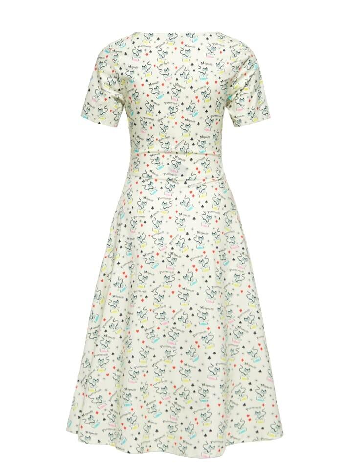Ощутите игривую элегантность в свободном платье от Queen Kerosin. Это платье, передающее очаровательный дух винтажного образа, украшено детальным принтом по всей поверхности с милыми кошачьими мотивами, которые придадут вашему образу нотку ретро-утонченности. V-образный вырез стильно подчеркивает декольте, а короткие рукава придают платью непринужденную элегантность. Благодаря разделяющему шву под грудью платье идеально сидит по фигуре и создает женственный силуэт. Свободная расклешенная юбка слегка раскачивается при каждом движении и подчеркивает жизнерадостный характер платья. Платье изготовлено из высококачественной смеси хлопка и эластана, его очень удобно носить даже в теплые дни. Боковая молния облегчает надевание и снятие и обеспечивает дополнительный комфорт. Наденьте его и перенеситесь в мир, полный ретро-приключений и элегантности. С каждым шагом вы будете чувствовать, будто прогуливаетесь по ностальгическим улицам 50-х годов.