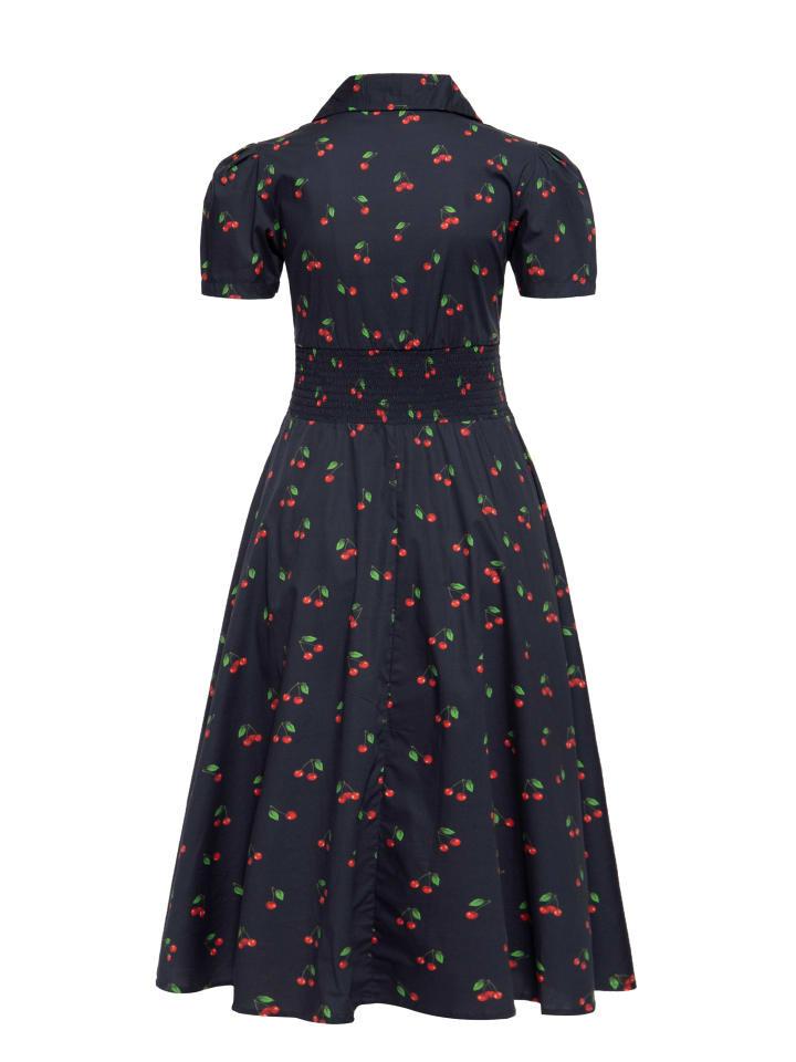 Ощутите стильный винтажный шарм в этом свободном платье от Queen Kerosin. Привлекательный вишневый узор по всей поверхности подчеркивает жизнерадостность и прекрасно подходит для летних случаев. Плоский воротник и пышные рукава, украшенные рюшами по швам, придают платью игривый, но элегантный вид. Пуговицы под дерево подчеркивают ностальгический дизайн, а эластичная вставка на талии гарантирует идеальную посадку и высокий комфорт при ношении. Расклешенная юбка А-силуэта элегантно раскачивается при каждом движении и делает платье притягивающим взгляды во время танца. ) событие. Смесь хлопка и эластана гарантирует, что платье будет удобно носить даже в теплые дни. Это летнее платье идеально подойдет каждой женщине, которая ищет несложный, но стильный винтажный образ и скрасит свою повседневную жизнь нотками ретро. нравится.